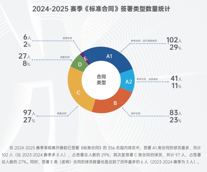 在2024-2025赛季常规赛开赛前已签署《标准合同》的356名国内球员中,签署A1类合同的球员最多,共计102人(比 2023-2024赛季多8人),占签署总人数的29%;其次是签署C类合同的球员,共计97人,占签署总人数的27%。同时,签署E类(老将)合同的球员数量也是达到了历年最多的6人(2023-2024 赛季为3人)。