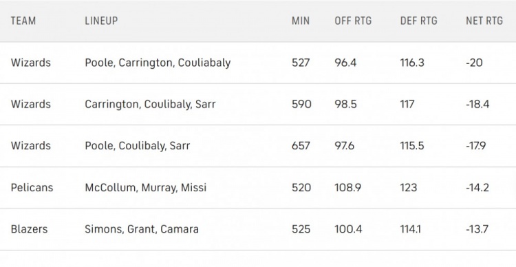 上图可见:倒数第一为奇才的普尔、卡林顿和库利巴利;倒数第二为奇才的卡林顿、库利巴利和萨尔;倒数第三为奇才的普尔、库利巴利和萨尔;倒数第四为鹈鹕的麦科勒姆、穆雷和米西;倒数第五为开拓者的安芬尼-西蒙斯、格兰特和卡马拉。