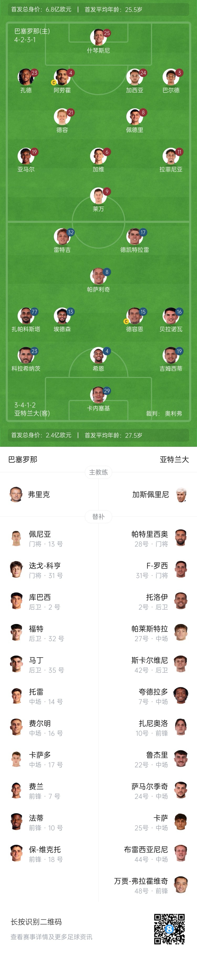 - 巴萨vs亚特兰大首发:莱万、亚马尔先发,德容、什琴斯尼出战