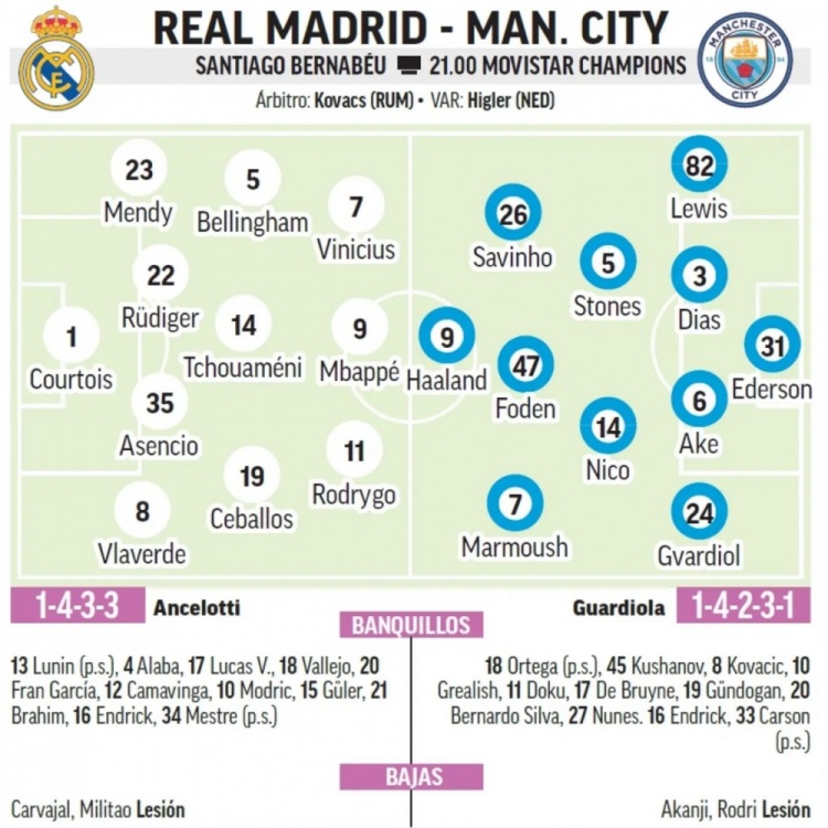 西班牙媒体《马卡报》预测了两队此役的首发阵容,皇马中卫组合为吕迪格+阿森西奥,巴尔韦德出任右后卫。曼城方面马尔穆什、尼科-冈萨雷斯、刘易斯首发。