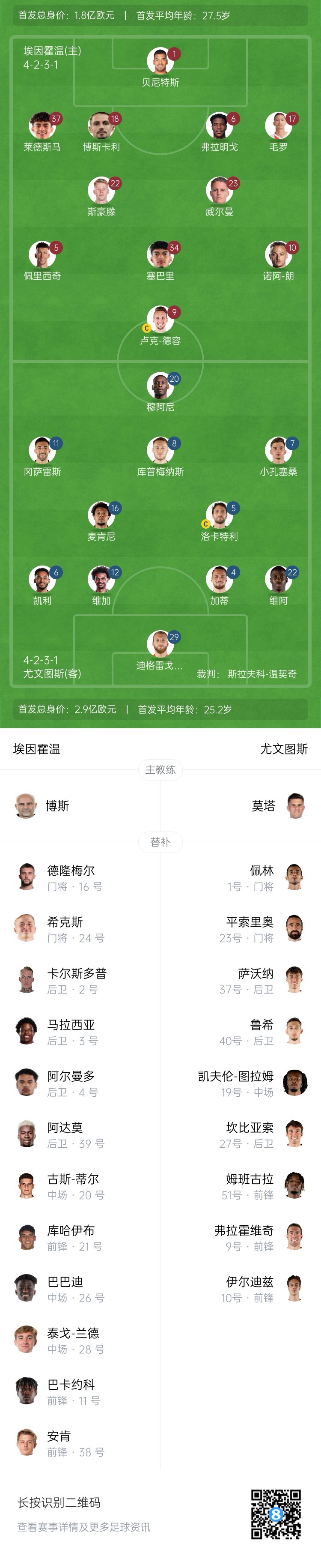 埃因霍温替补:16-德隆梅尔、24-希克斯、2-卡尔斯多普、3-马拉西亚、4-阿尔曼多、39-阿尔莫、20-古斯-蒂尔、21-库哈伊布、26-巴巴迪、28-泰戈-兰德、11-约翰-巴卡约科、38-安肯