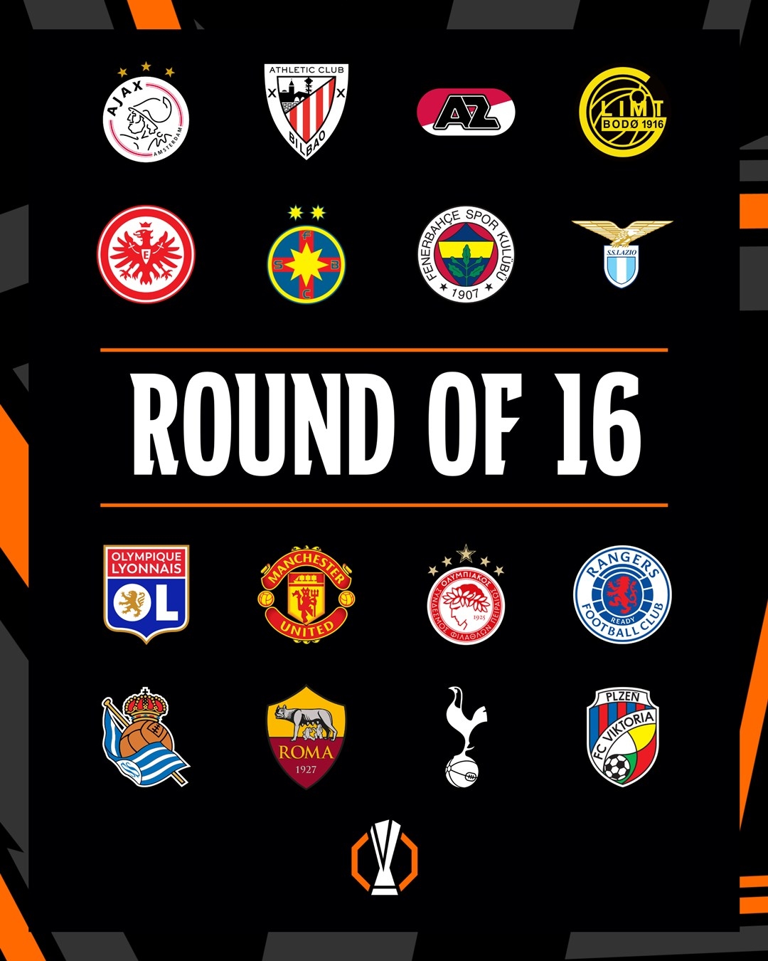 欧联16强:拉齐奥、毕巴、曼联、热刺、法兰克福、里昂、奥林匹亚科斯、流浪者、阿尔克马尔、罗马、布加勒斯特星、博德闪耀、比尔森胜利、皇家社会、费内巴切、阿贾克斯