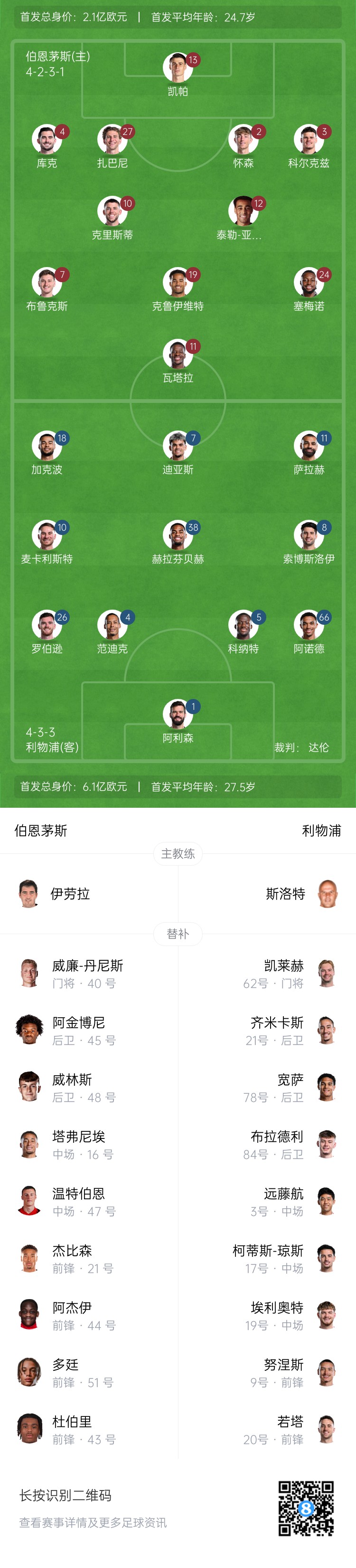 伯恩茅斯替补:40-威尔-丹尼斯、16-塔弗尼埃、44-阿杰伊、45-阿金博尼、47-温特伯恩、48-马克西-威林斯、51-里斯-多廷、21-杰比森、43-杜伯里