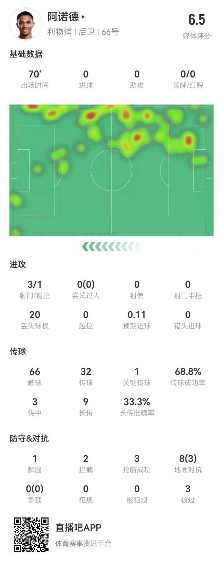 - 阿诺德本场3被过+2失误导致对方射门+20丢失球权 获评6.5分