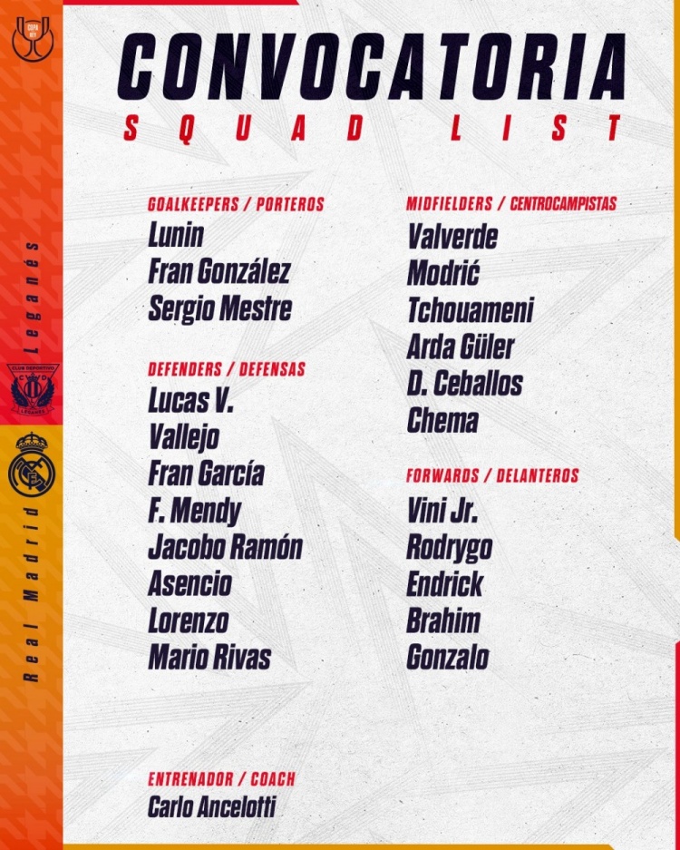 - 皇马国王杯大名单:姆巴佩、贝林、裤袜缺席,维尼修斯、魔笛出战