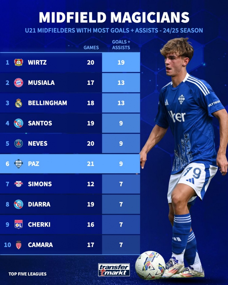 五大联赛U21中场参与进球:维尔茨19球最多,帕斯9球并列第四